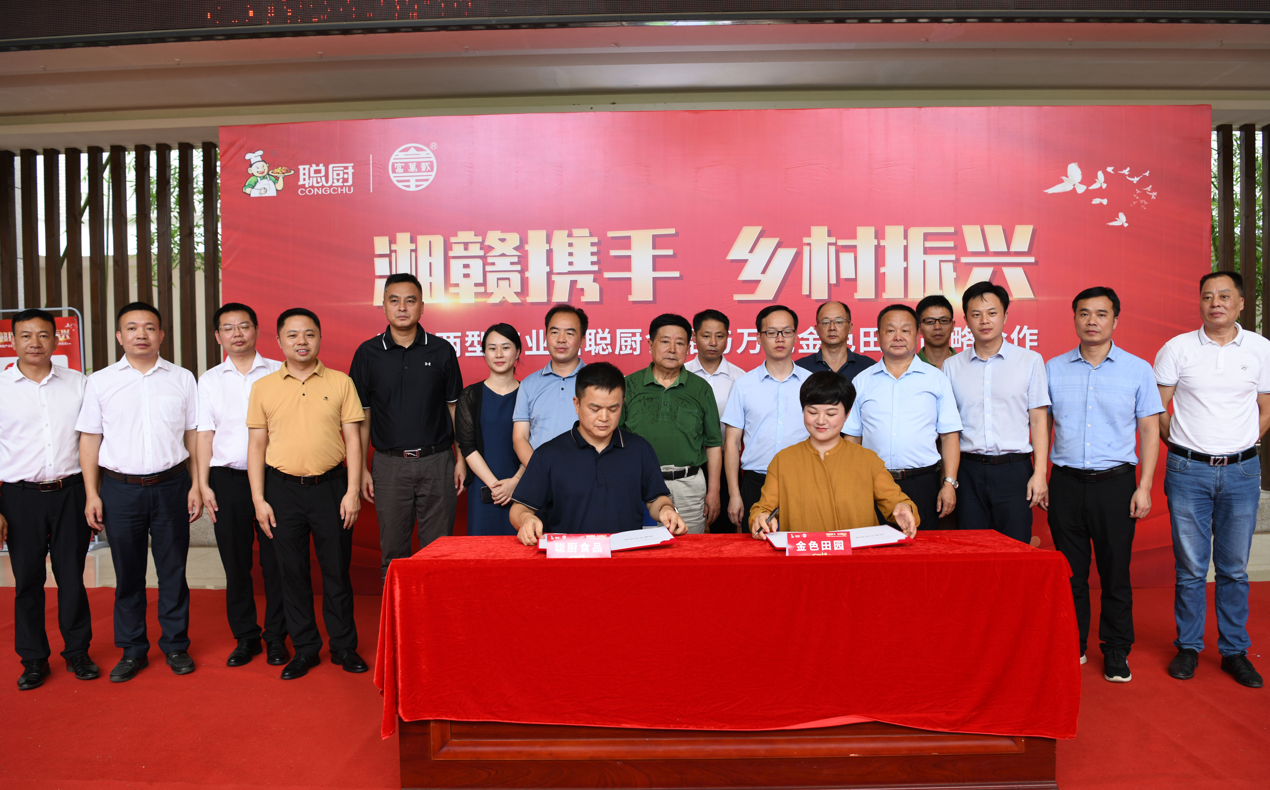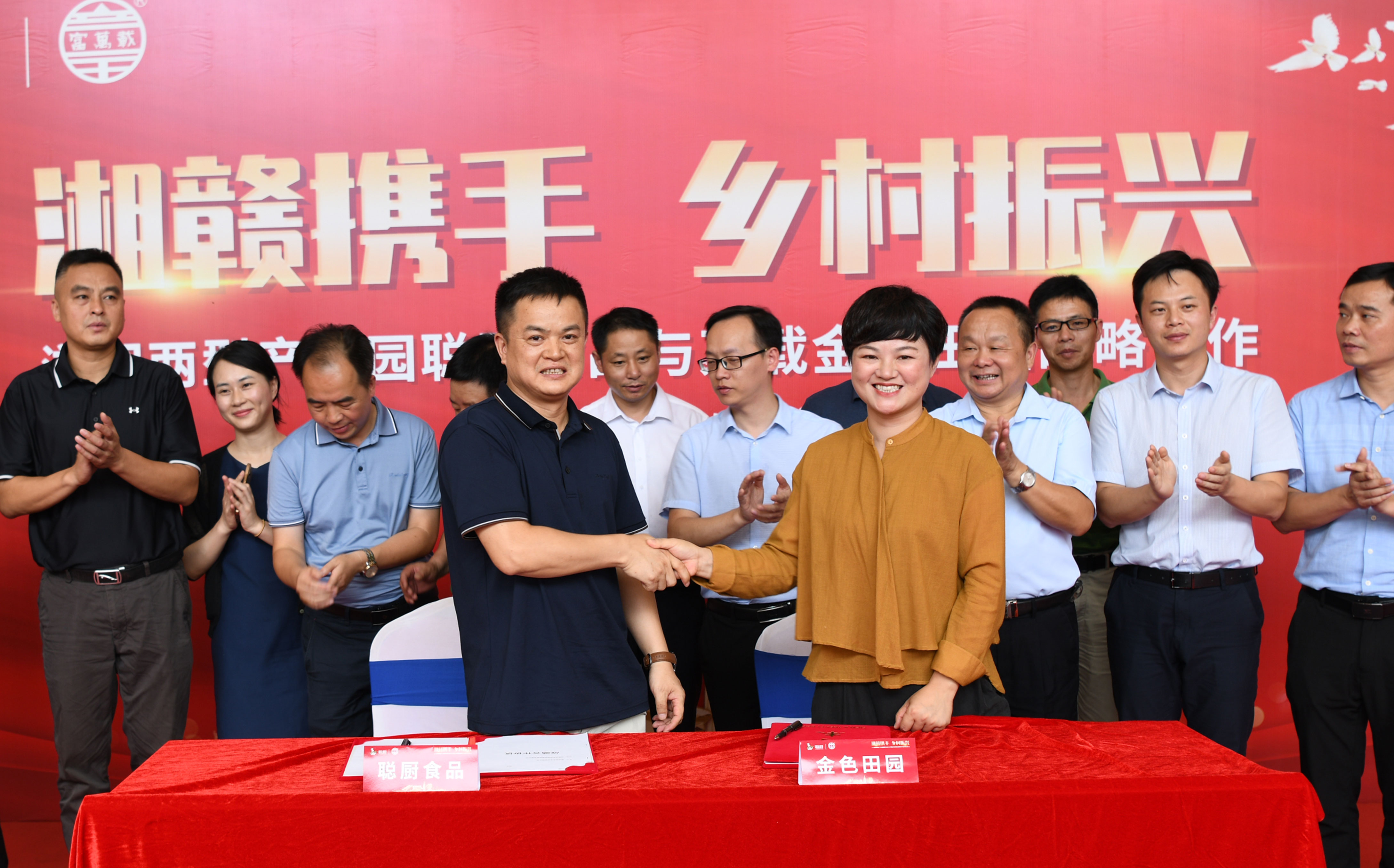 最后,唐步聪和黄丽分别代表湖南新易游体育有限公司和江西万载金色田园电商扶贫有限公司在合作协议上签字,所有现场领导和嘉宾一同见证了这个象征湘赣边乡村振兴新征程正式起航的历史时刻。